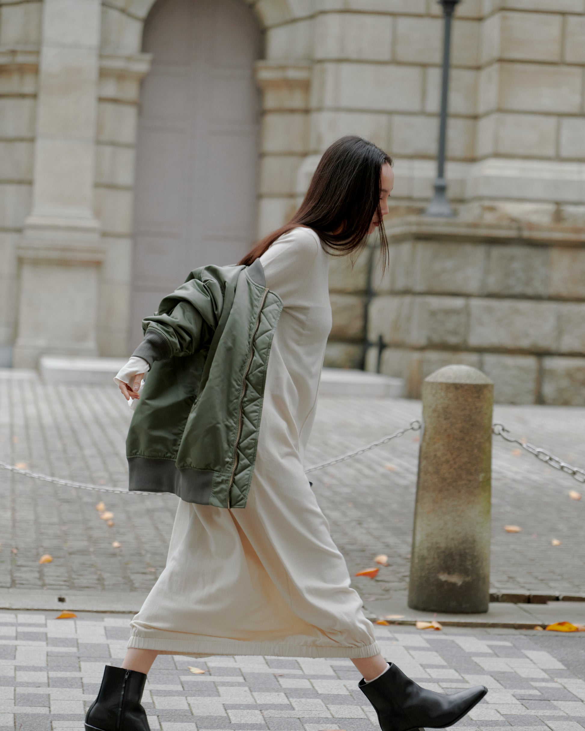 足元にはブーツを合わせて、ミニマルで静かな強さを纏うスタイルに。