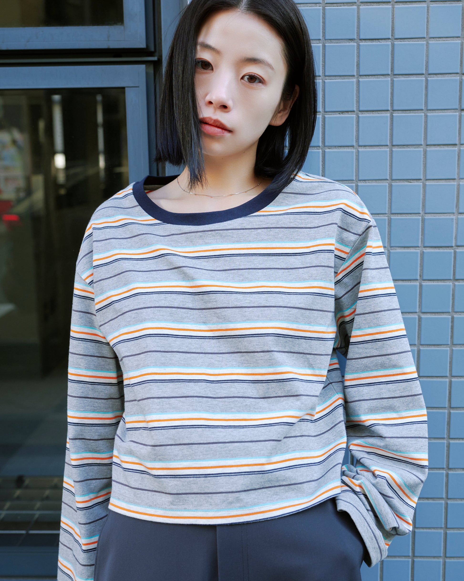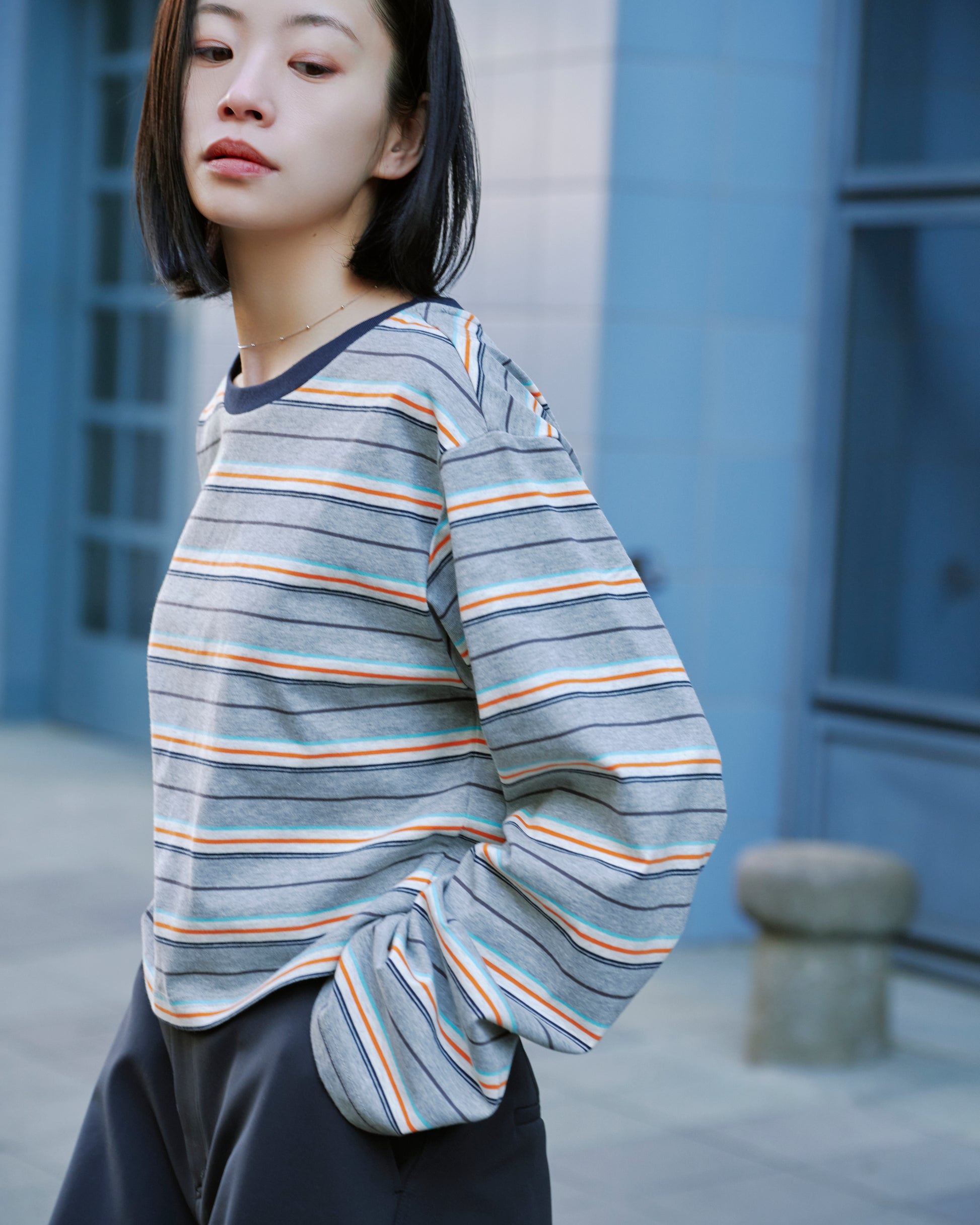 カラーボーダーが印象的なロングスリーブトップス。