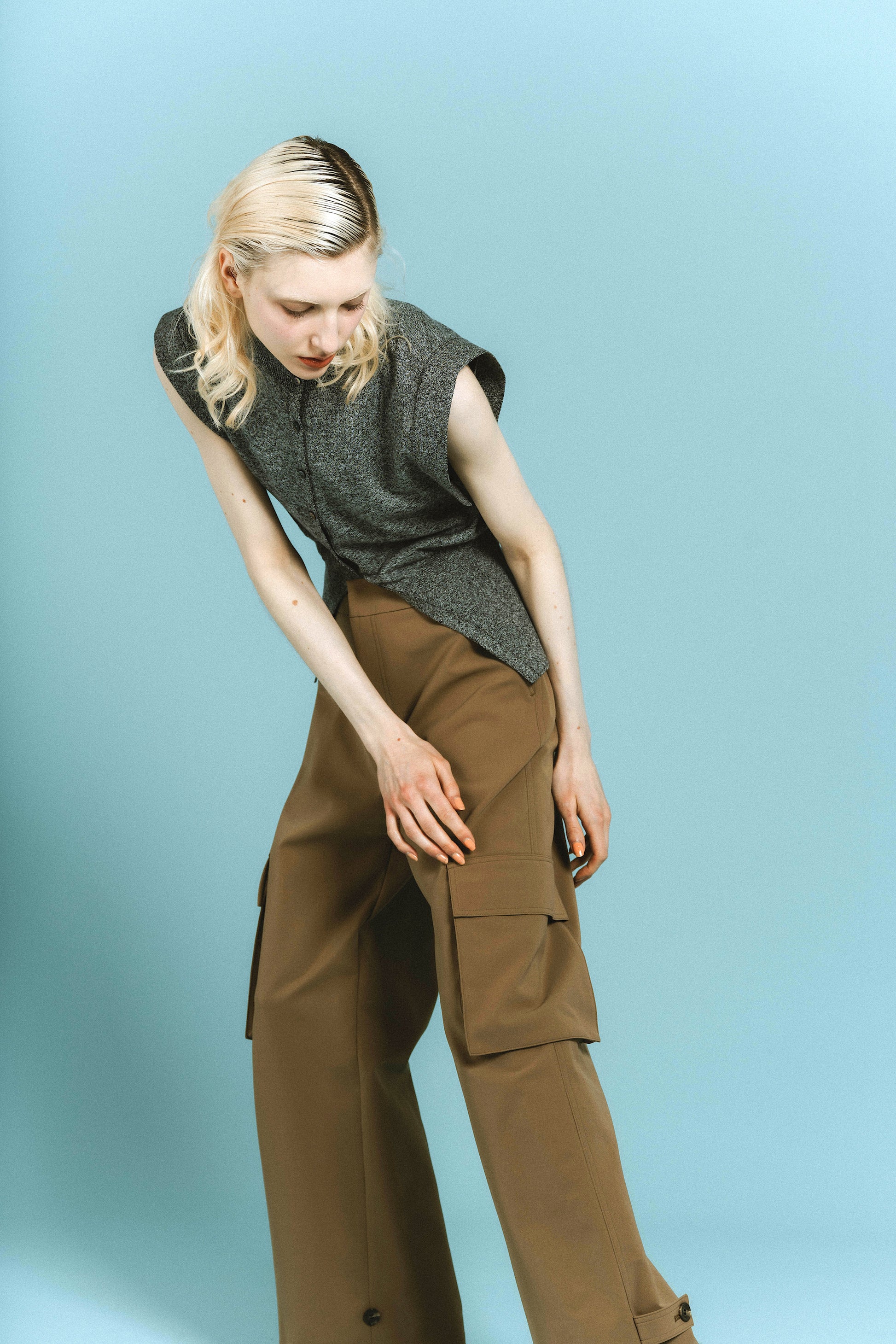 裾にはボタン付きタブを施しており、シルエットのアレンジも可能。