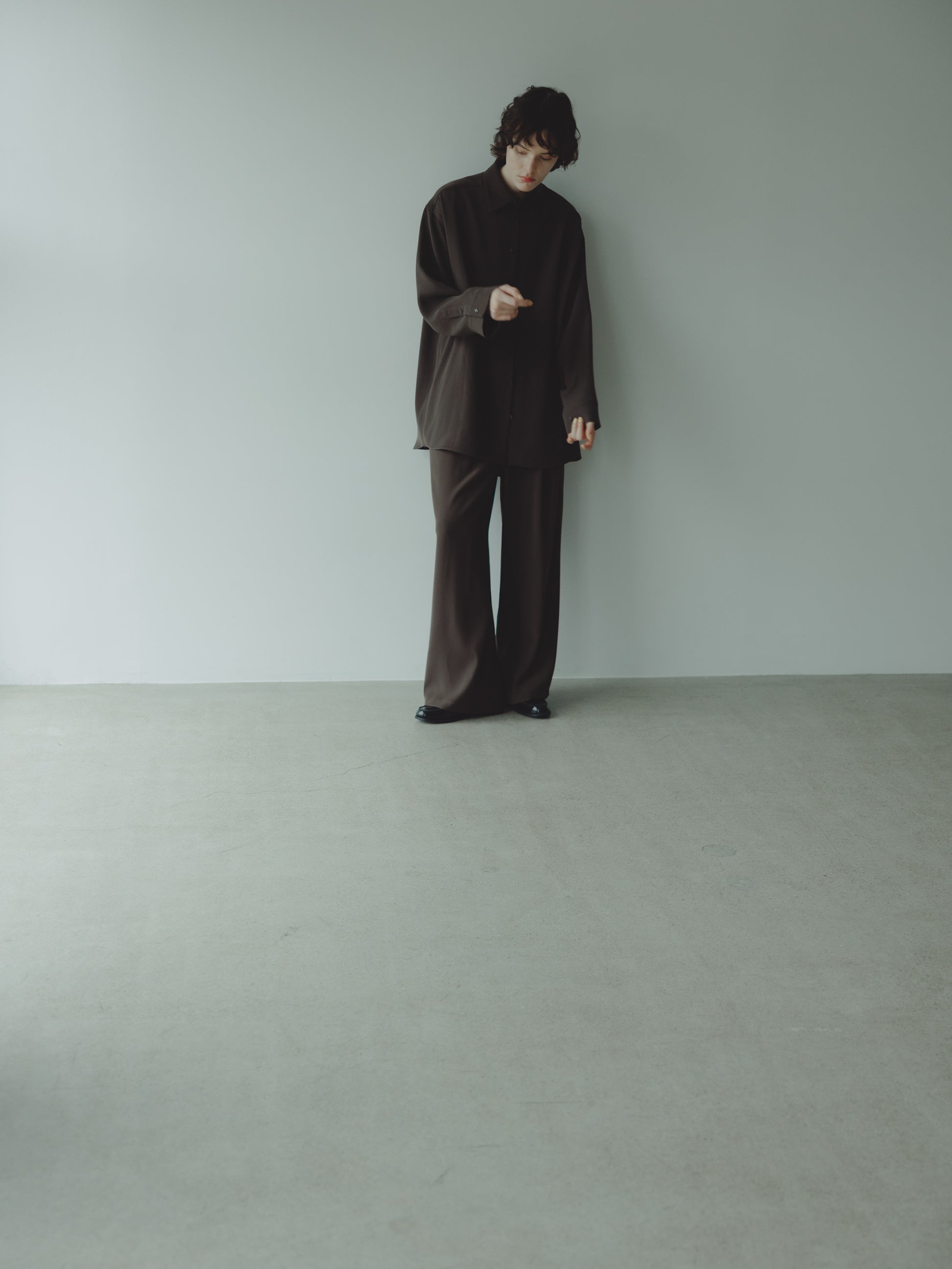 とろみのあるポリエステル素材を使用した、オーバーサイズシャツ。