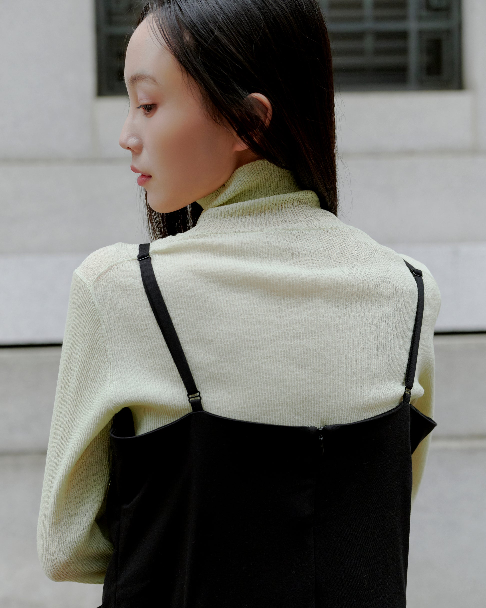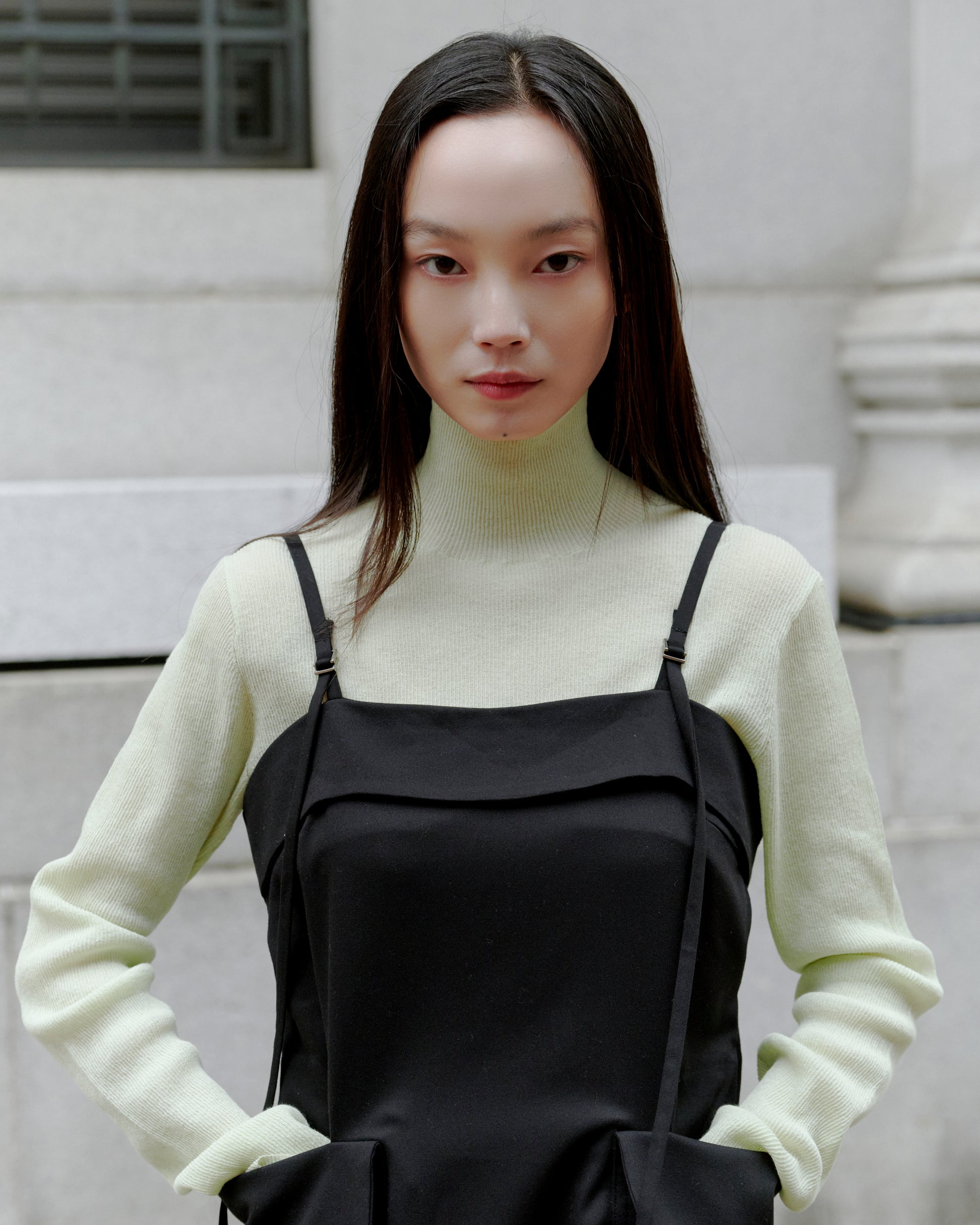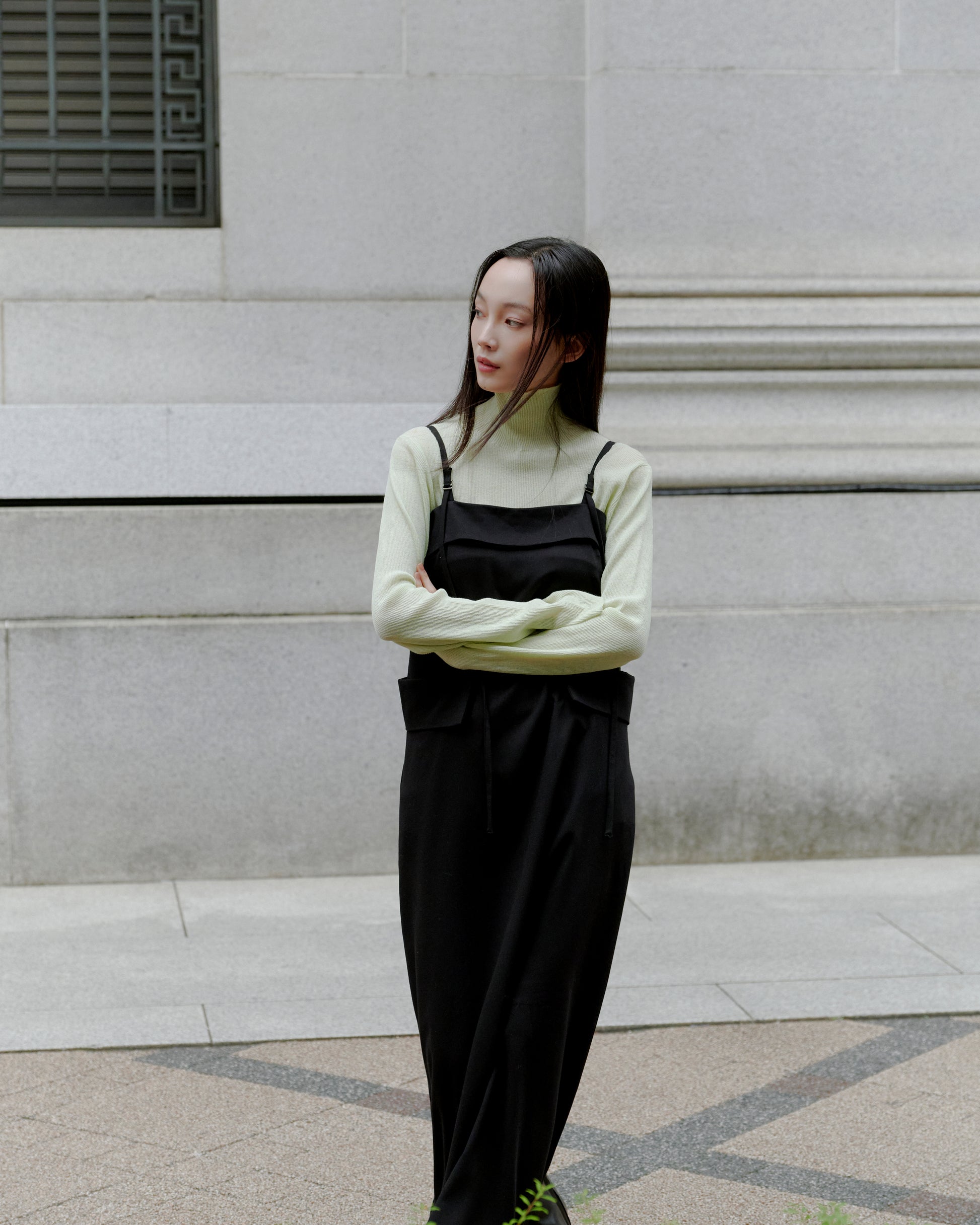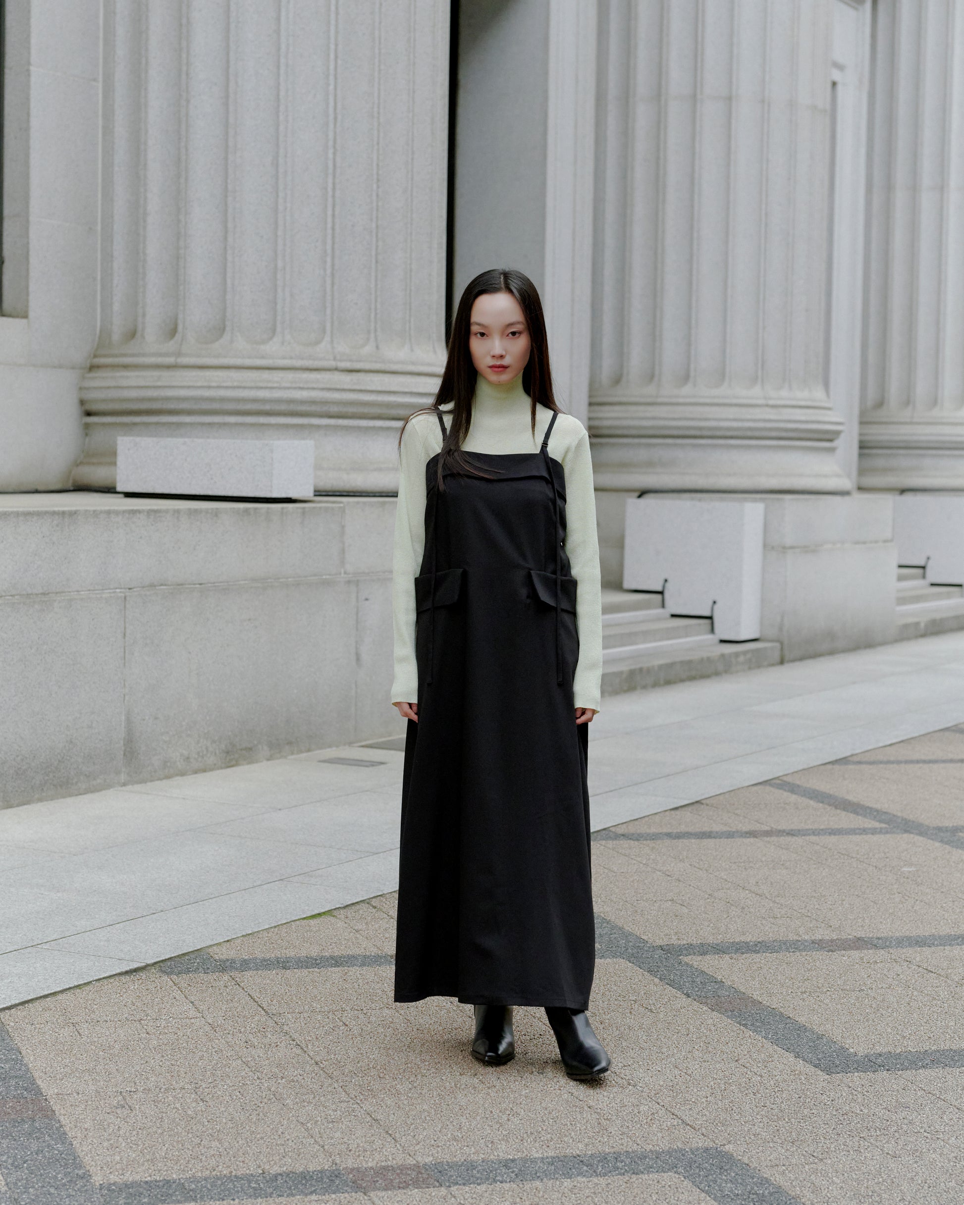 肩の細ストラップとサイドのポケットが、シンプルな中にさりげないニュアンスを添え、タートルネックや薄手トップスと重ねることで、季節を問わず楽しめる一着です。