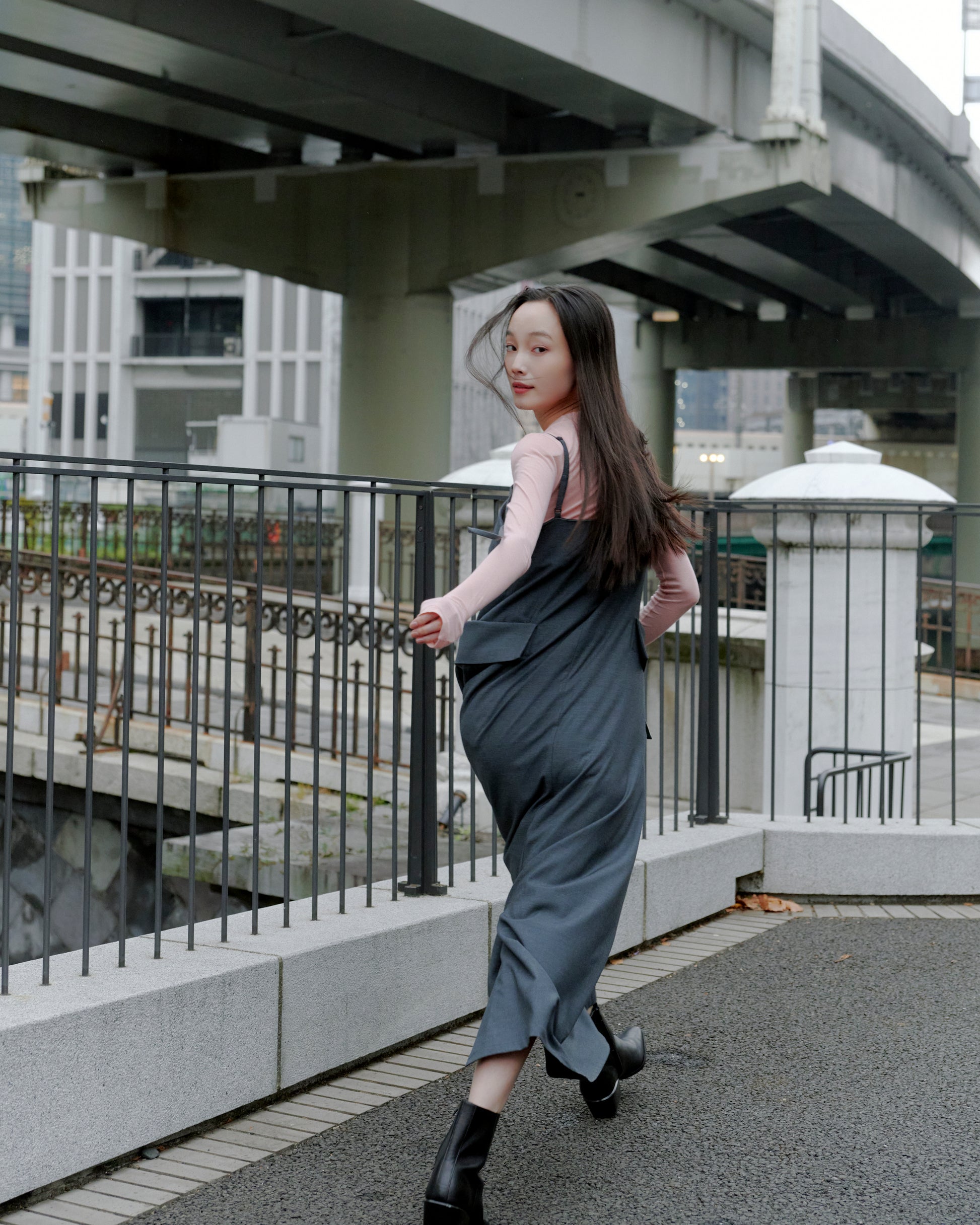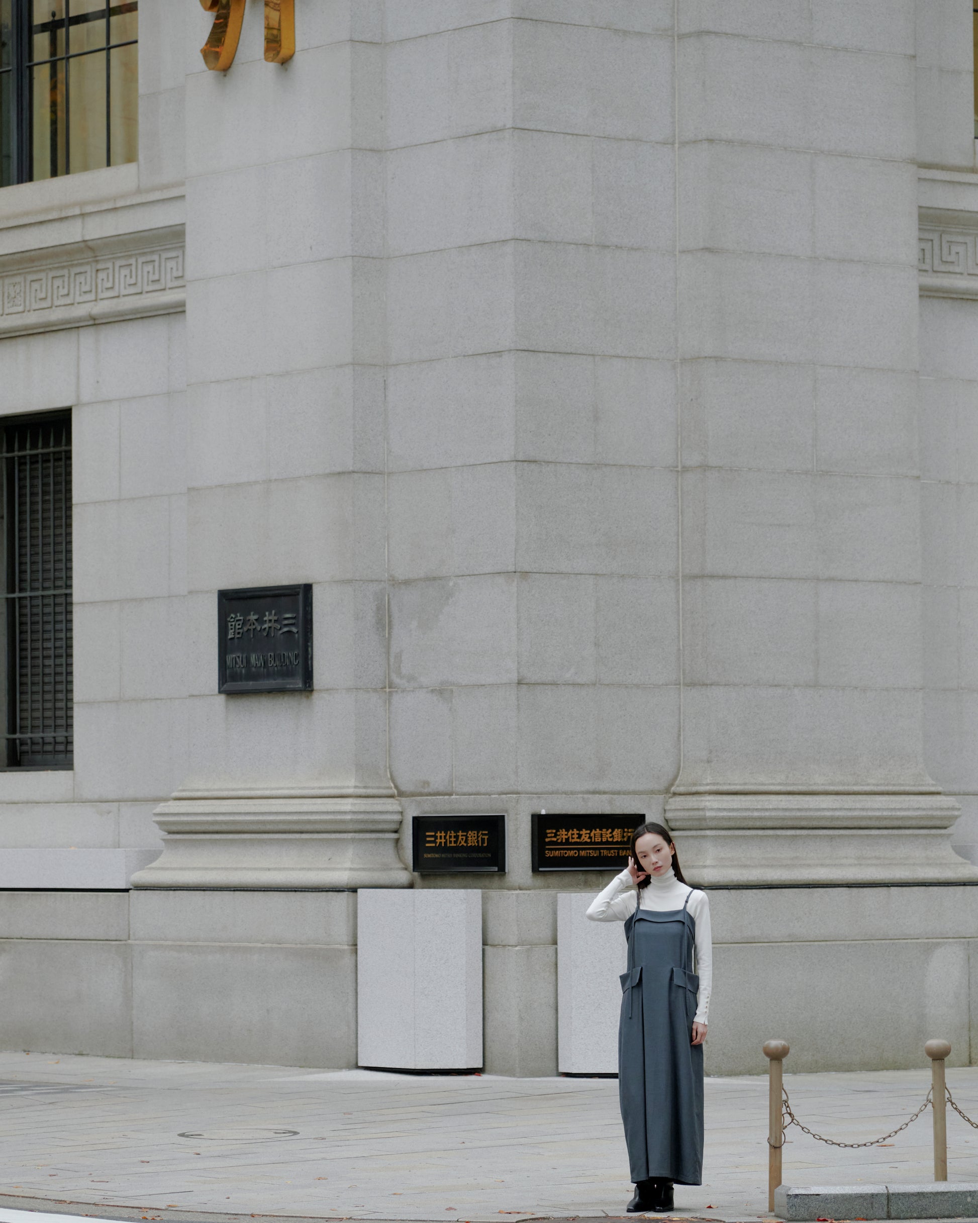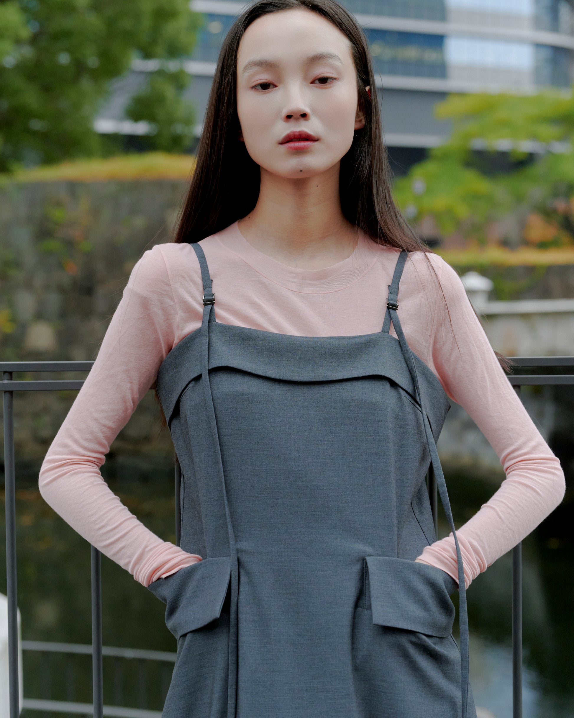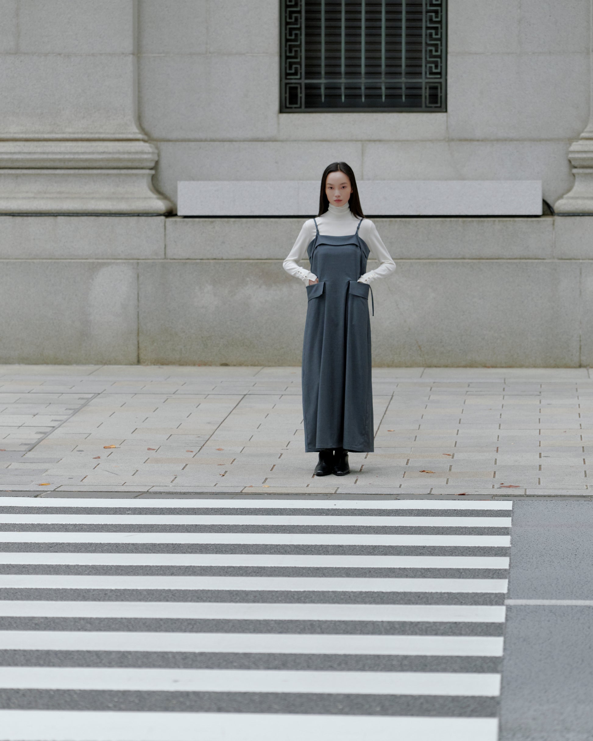 肩の細ストラップとサイドのポケットが、シンプルな中にさりげないニュアンスを添え、タートルネックや薄手トップスと重ねることで、季節を問わず楽しめる一着です。