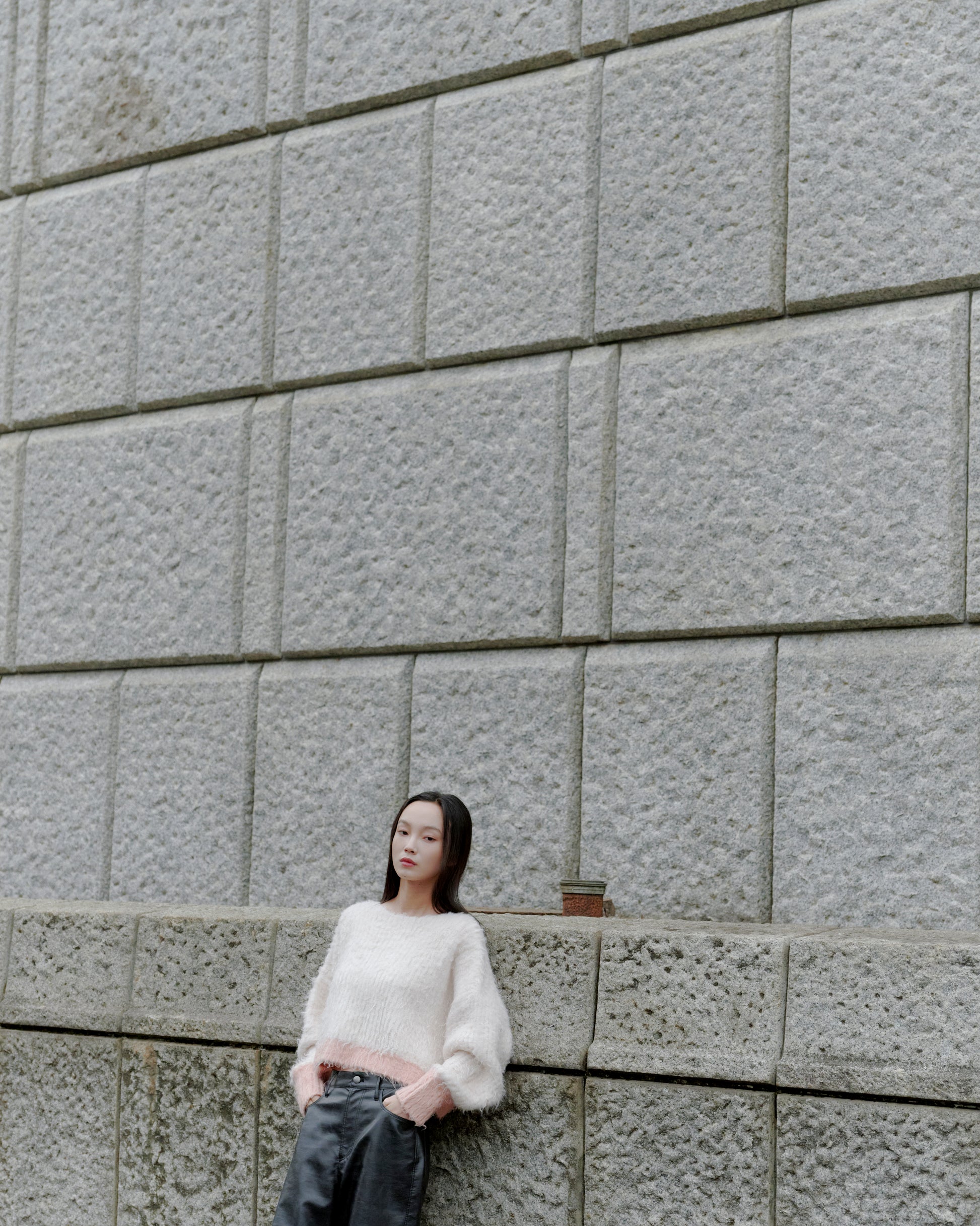 ふわっとした素材感が空気を含み、ボリュームを出しすぎずにやわらかいシルエットをつくり出します。