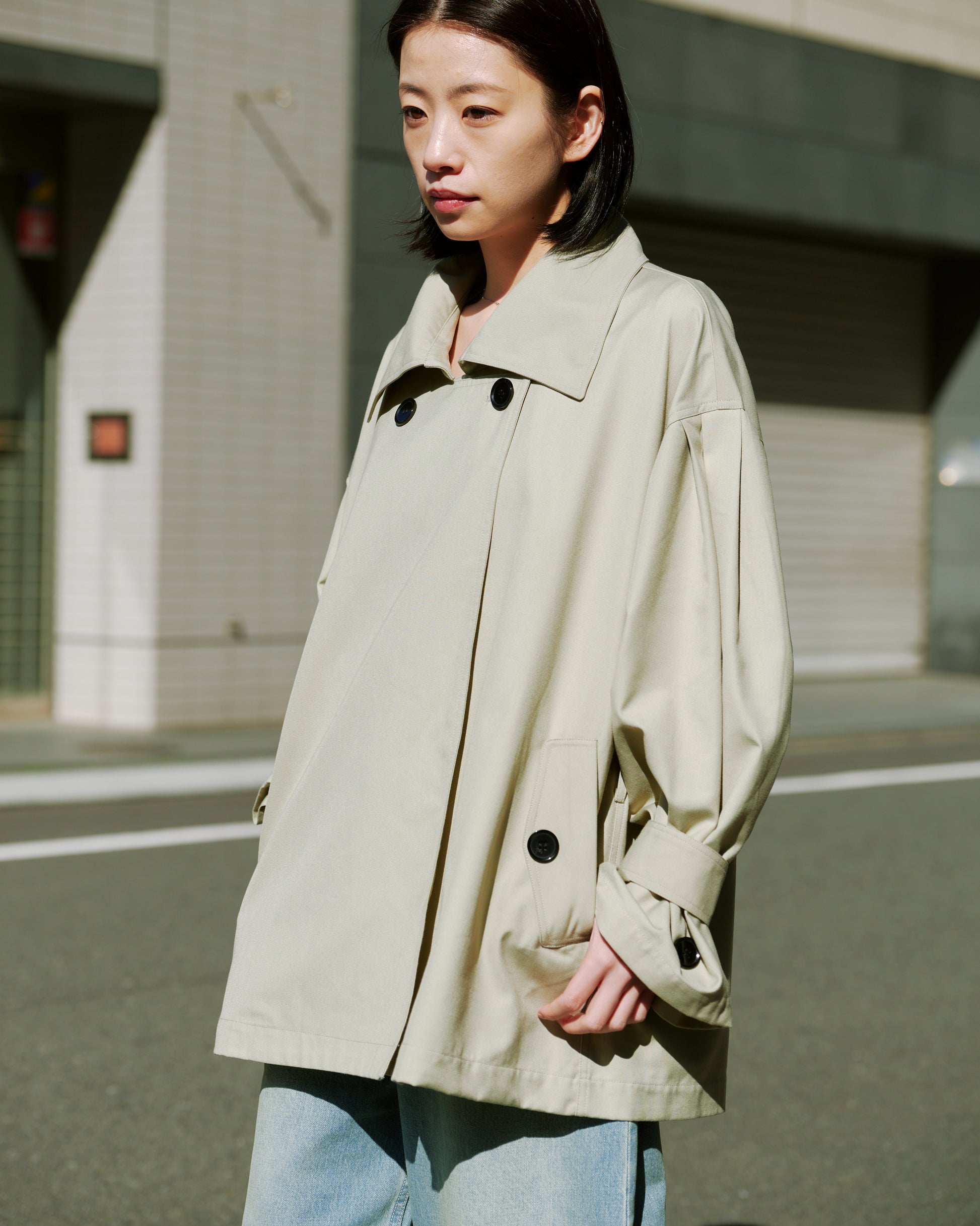 クラシックなトレンチディテールを、モードなシルエットで再構築したショートトレンチ。