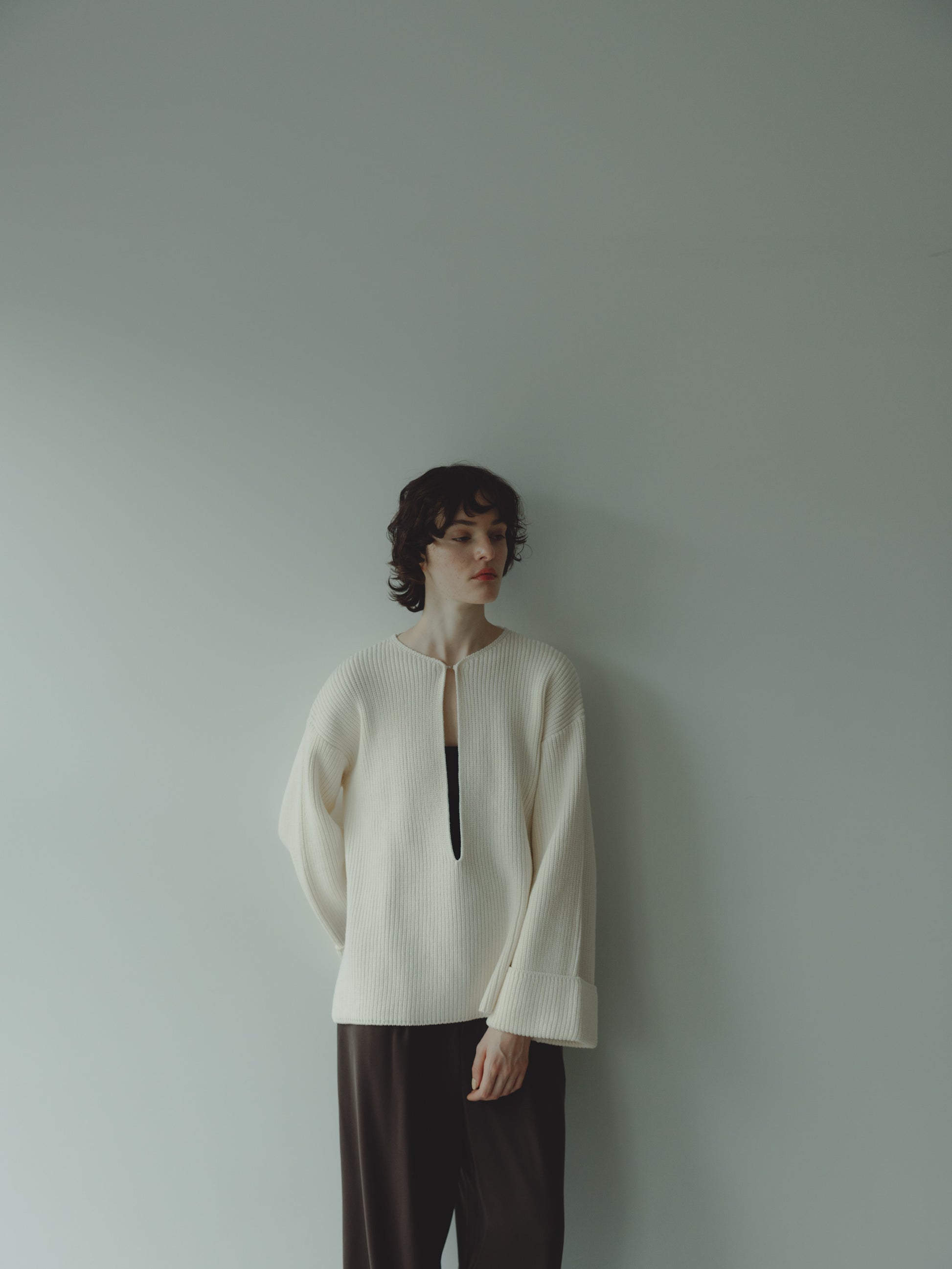 深めのVネックとスリットネックの2つの表情を楽しめます。
